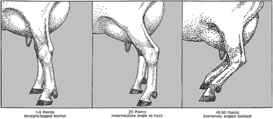 This trait relates to the durability of the legs and feet, as reflected by the degree of angle of the hock. By looking at the goat from the side, the appraiser can evaluate the degree of angle to the rear leg. The less angle or postier the leg, the lower the score. An intermediate angle in the hock relates to the midpoint of the range. Legs that tend toward straightness (or postiness) are assigned 20 or less points. Legs that tend toward greater angulation are assigned 30 or more points.