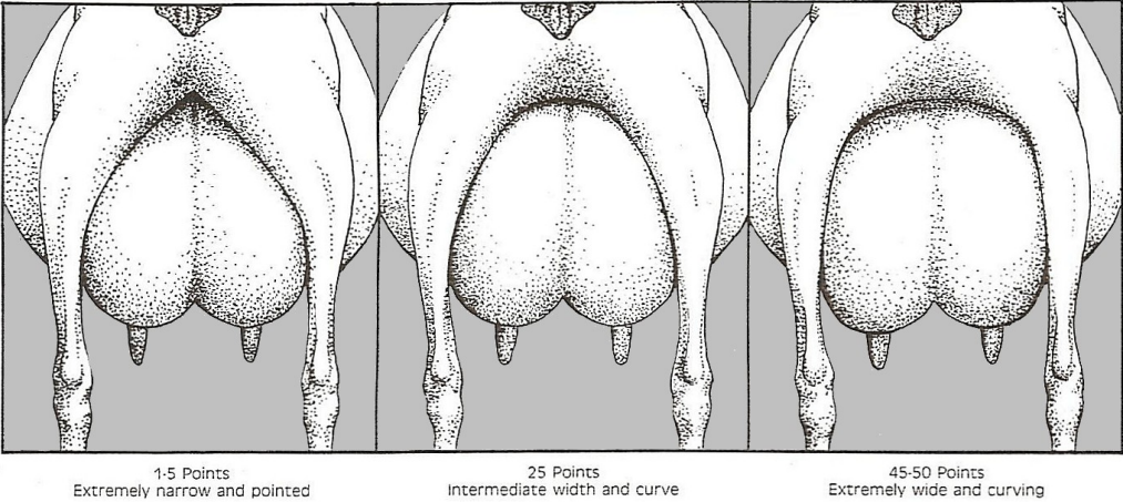The evaluation of rear udder arch considers both the width and the shape of the attachment of the rear udder. The rear udder arch is an indication of the goat’s potential capacity for milk, in that the width and shape of the rear udder attachment affects udder capacity, and the udder’s ability to hold its shape and position through repeated lactations. An extremely narrow and pointed rear udder arch is assigned 5 or less points, a rear udder intermediate in width and arch is assigned 25 points, and a rear udder that is extremely wide and arched assigned 45 or more points. Rear udder arch is evaluated at the same spot as rear udder height. Differences in hair and skin texture between the udder and the escutcheon are used to determine the point of attachment. This trait is called Escutcheon Arch in the Optional Young Stock program.