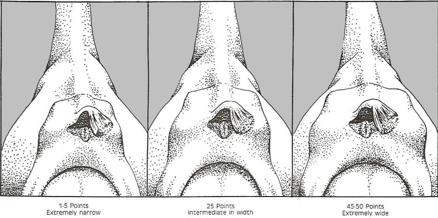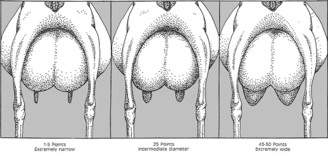 The width of the rump is important for three reasons. The width of the rump relates to kidding ease; the wider the rump or pelvis, the easier the delivery of kids. The width of the rump also is an indicator of general body width throughout, as well as the potential for udder width. Rump width is determined as the width between the thurls; that is, the width of the pelvic girdle. An extremely narrow rump (5” or less) is assigned 5 points or less, a rump of intermediate width (7”) is assigned 25 points, and an extremely wide rump (9” or more) is assigned 45 or more points. Rump Width in Miniature breeds is recorded in inches to the nearest ¼ inch as data is collected to determine the biological range. Rump Width in the Optional Young Stock program will be recorded in actual inches, rather than assigning a point value. The appraiser determines the width of the pelvic region from thurl to thurl. Each 1’ difference in rump width, plus or minus, results in a difference in the score of 10 points.