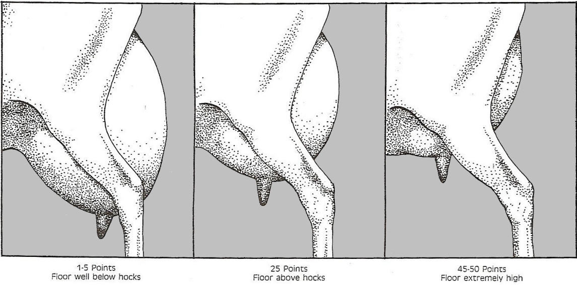 The depth of the udder is measure relative to the hocks. While some degree of udder depth is necessary for capacity, an udder that is extremely deep is more susceptible to injury and mastitis infection. Udder depth is evaluated as the vertical distance between the floor of the udder and the point of the hock, when the rear leg is set in a normal position under the animal. A deep udder that is at least 2” below the hocks is assigned 5 or less points, an udder that is intermediate in depth (2” above the hocks) is assigned 25 points, and a shallow udder that is extremely high above the hocks (6” or more) is assigned 45 or more points. An udder that is 3” or more below the hock is assigned 1 point. Proportional adjustment is made for miniature breeds.