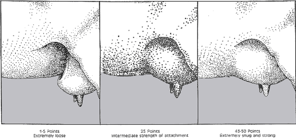 In evaluating the fore udder attachment, the appraiser looks at the strength of the attachment of the lateral ligaments as they extend forward and laterally to the body wall. The scale ranges from an extremely loose attachment (5 points or less) to an extremely snug and strong attachment. Fore udders with lateral ligaments that are intermediate in strength and tightness are assigned 25 points.