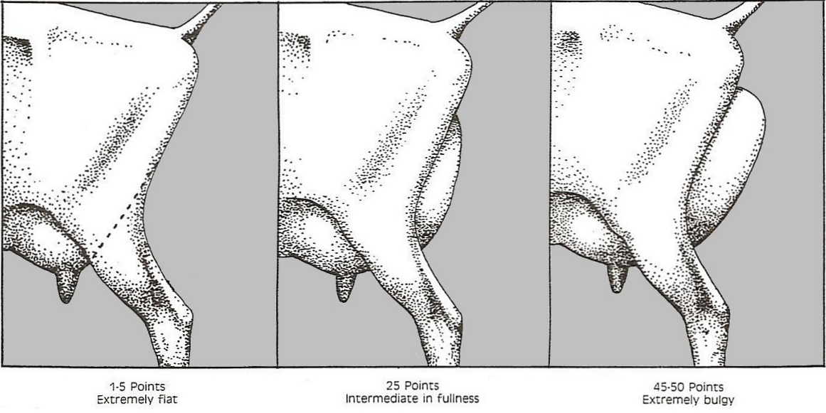 Rear udder, side view, is evaluated as the shape of the rear udder as it extends behind the rear leg when a goat is standing with her rear legs squarely beneath her. The shape of the rear udder from the teats to the rear udder attachment is an indication of the capacity of the rear udder for milk. Extremely flat rear udders, with little capacity, are assigned 5 or less points; rear udders with intermediate fullness are assigned 25 points; and rear udders that are extremely bulgy or protruding are assigned 45 or more points.