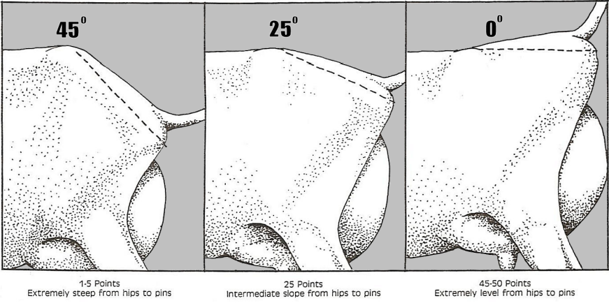 The angle of the rump or pelvis from hips to pins has a direct bearing on the reproductive performance of a goat because it influences the ease of kidding and drainage of the reproductive tract. The angle of the rump is also related to the length of udder from fore to rear, strength of fore udder attachment, and udder depth. Observing the goat on the move from the side, the appraiser evaluates the angle of the rump from the hips to the pins. Rump angle is measured from steepness, which is assigned 20 or less points, to levelness, which is assigned 30 or more points. Rumps intermediate in slope (30° to 20°) are assigned 20 to 30 points. Each difference of 5° in the rump angle, plus or minus, results in a difference in the score of 5 points. A rump angle of 50° or more is assigned 1 point.