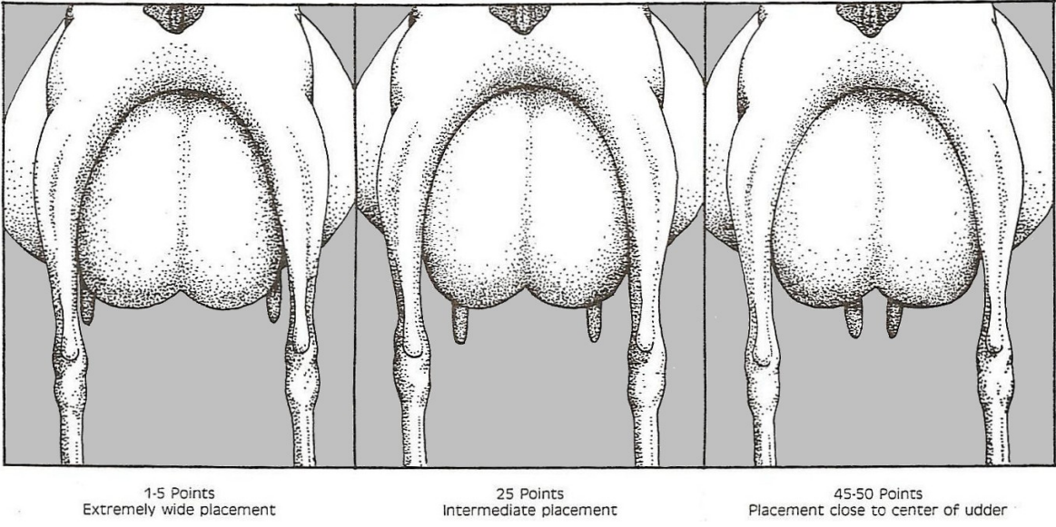 Teat placement, as viewed from the rear, is related to both ease of milking and susceptibility to injury. Teat placement is measured from being on the outside third of the udder half (less than 25 points) to being less than two-thirds of the way out (more than 25 points). Teats that are located one-third of the way out on the udder half are assigned 45 points; teats that are less than one-third of the way out are assigned more than 45 points. Position is determined by the center of the teat at the point where the teat attaches to the udder
